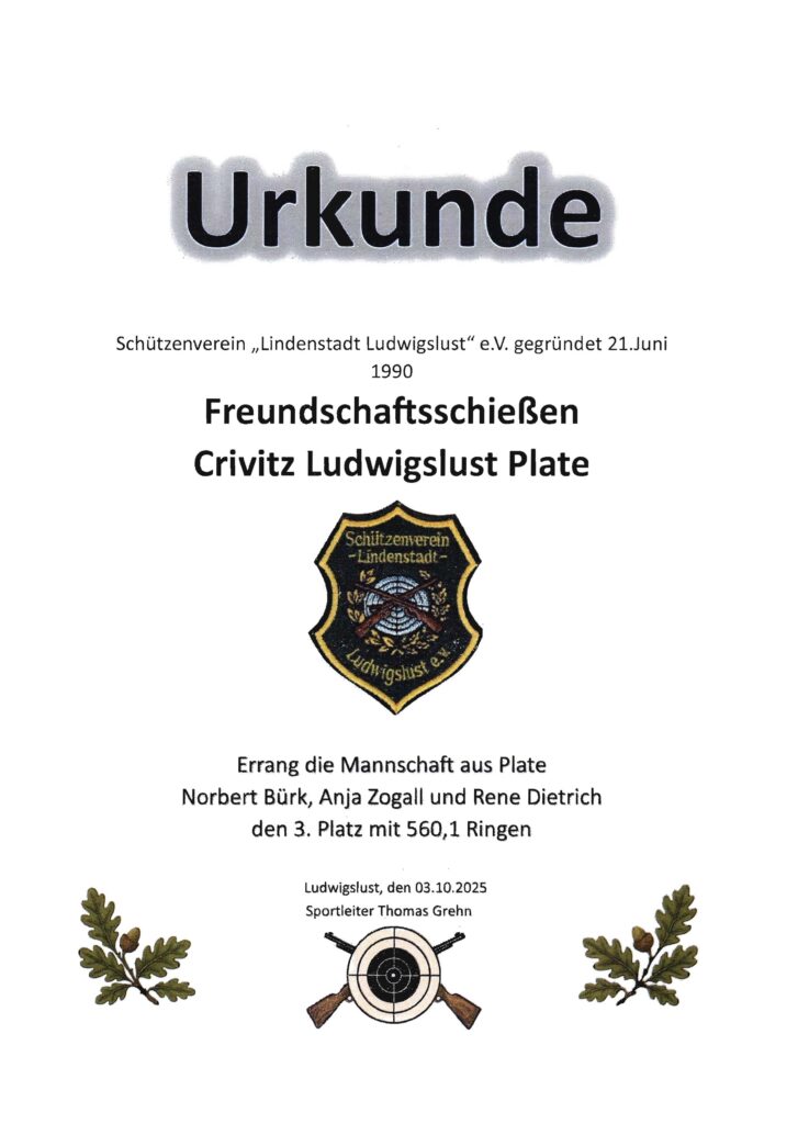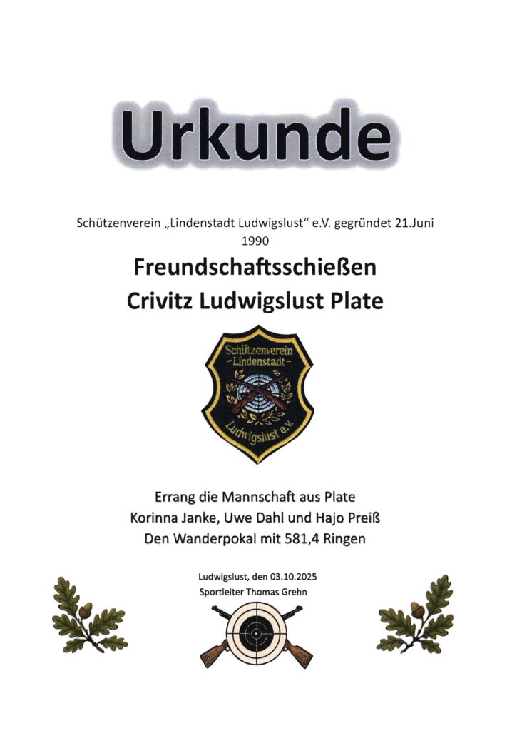 Am 3. Oktober trafen sich traditionsgemäß die Schützenvereine aus Crivitz, Plate und Ludwigslust zum diesjährigen Freundschaftsschießen beim Schützenverein Lindenstadt in Ludwigslust. Bei kalten Temperaturen, aber bestem Herbstwetter lieferten sich die Mannschaften einen spannenden und fairen Wettkampf um den begehrten Wanderpokal.